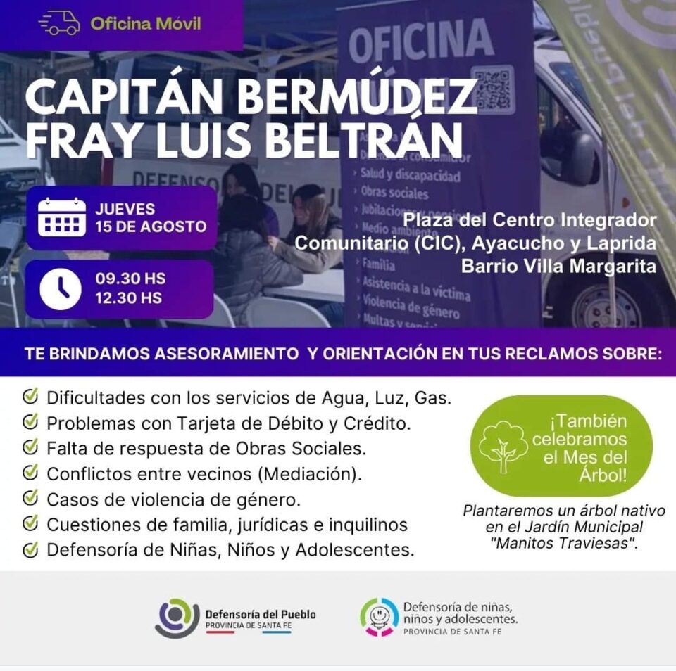 El jueves 15 de agosto, la #OficinaMóvil de la Defensoría del Pueblo de Santa Fe estará junto con la Defensoría de Niñas, Niños y Adolescentes en Capitán Bermúdez y Fray Luis Beltrán (Plaza del Centro Integrador Comunitario, Ayacucho y Laprida, barrio Villa Margarita) de 09:30 a 12:30 hs.