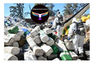 Durante la inspección, se tomaron muestras sólidas y líquidas en diferentes puntos del predio para su análisis: suelo impactado en la zona de la laguna y el desagüe del galpón, así como líquidos en el interior del área de procesamiento. También se realizaron registros fotográficos del estado de las instalaciones y de etiquetas identificatorias que constataron la presencia de compuestos peligrosos como glifosato, atrazina y metolaclor.