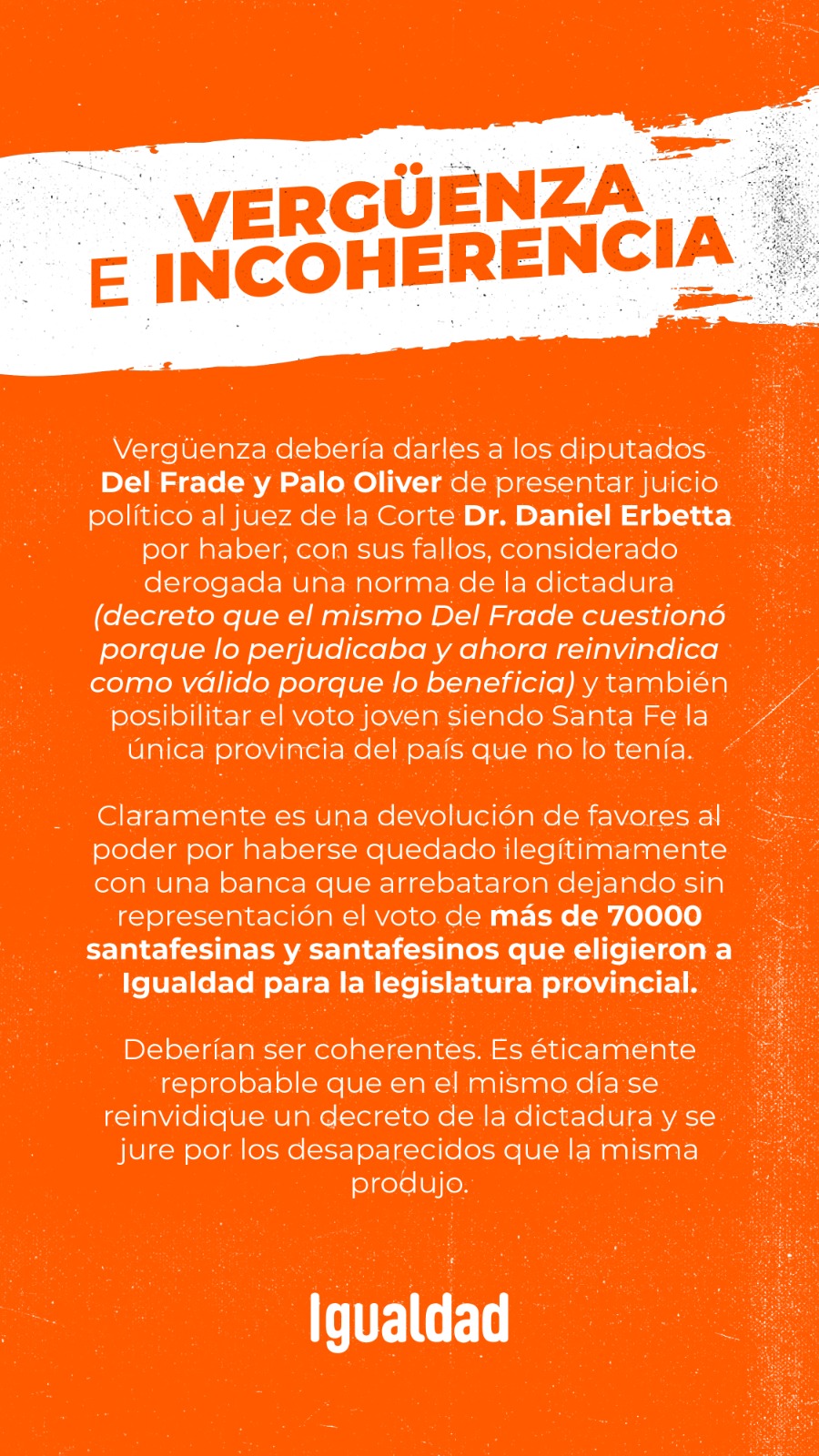 El comunicado, destaca las contradicciones en las declaraciones y acciones de los diputados Frade y Oliver, y critica con firmeza la decisión de impulsar un juicio político contra el juez Erbetta. Se argumenta que esta acción no solo es injustificada sino también una fuente de vergüenza para los responsables, al parecer ignorar principios básicos de justicia y legalidad.