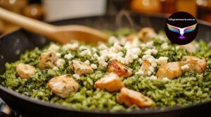 Añade el arroz a la sartén y mézclalo con las espinacas, dejando que se impregne del sabor durante 1-2 minutos. Agrega el caldo de pollo y lleva a ebullición. Reduce el fuego, cubre y cocina por 20 minutos o hasta que el arroz esté tierno.