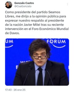 En un reciente comunicado, Gonzalo Castro, presidente del partido político Seamos Libres, expresó su firme apoyo al presidente argentino Javier Milei tras su intervención en el Foro Económico Mundial de Davos. A través de su cuenta de X (ex Twitter), Castro destacó la importancia de debates sobre temas controversiales en un contexto global que, según él, enfrenta un avance preocupante de lo que denomina «la agenda woke».