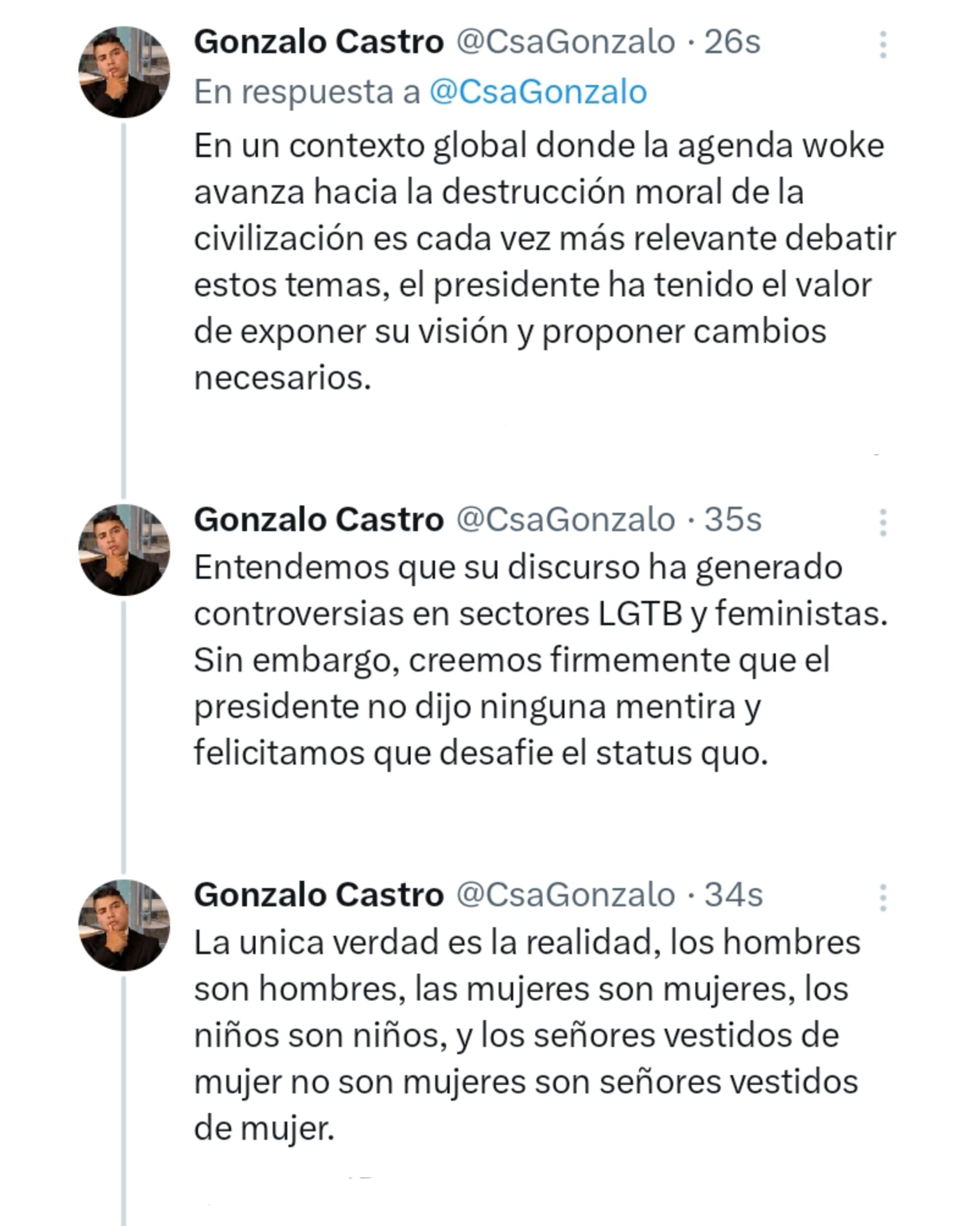 En sus tweets, Castro abordó la noción de «autopercepción», argumentando que no debe ser considerada un argumento válido en el debate actual. En su opinión, si solo se basaran en la autopercepción, no existirían límites morales, lo que podría llevar a situaciones éticamente cuestionables. Castro también criticó lo que considera una asociación entre el progresismo y la pedofilia, sugiriendo que los defensores de la agenda progresista se sienten aludidos por las declaraciones del presidente.