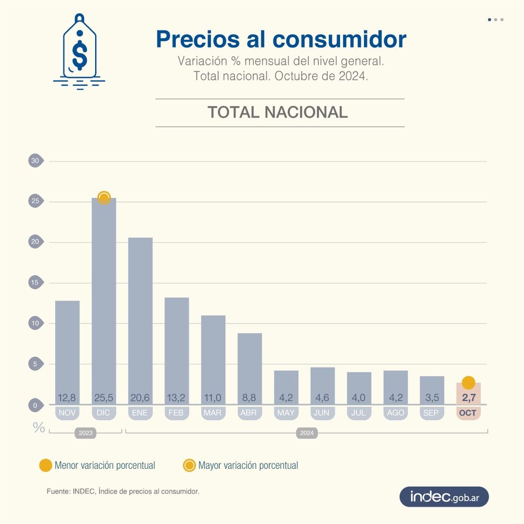URGENTE: EL INDICE DE INFLACIÓN DEL MES DE OCTUBRE ES DE 2,7% Facebook Twitter WhatsAppDato INDEC Los precios al consumidor (IPC) aumentaron 2,7% en octubre de 2024 respecto de septiembre y 193% interanual. Acumularon un alza de 107% en los primeros diez meses del año Facebook Twitter WhatsApp